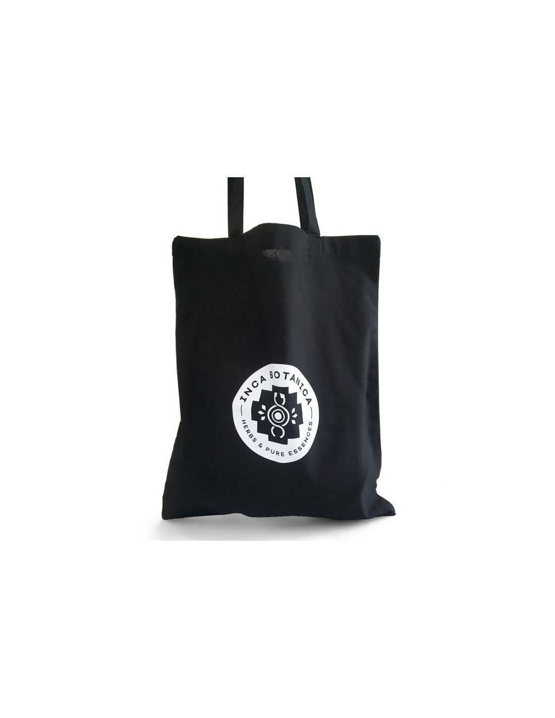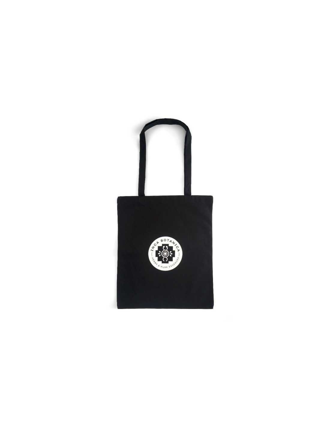 Schwarze Werbetasche aus Stoff mit langen Griffen und Inca Botanica-Logo.