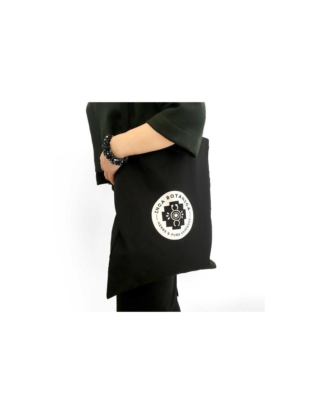 Černá reklamní látková taška s dlouhými uchy a logem Inca Botanica.